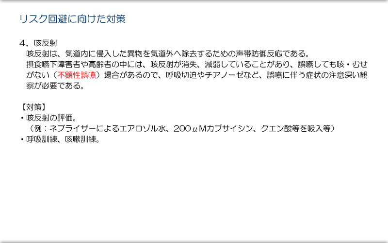 3. 直接嚥下訓練および食事介助方法:食品を用いる直接嚥下訓練および食事介助者の技能(skill)がリスク発生に影響を及ぼすことがある。