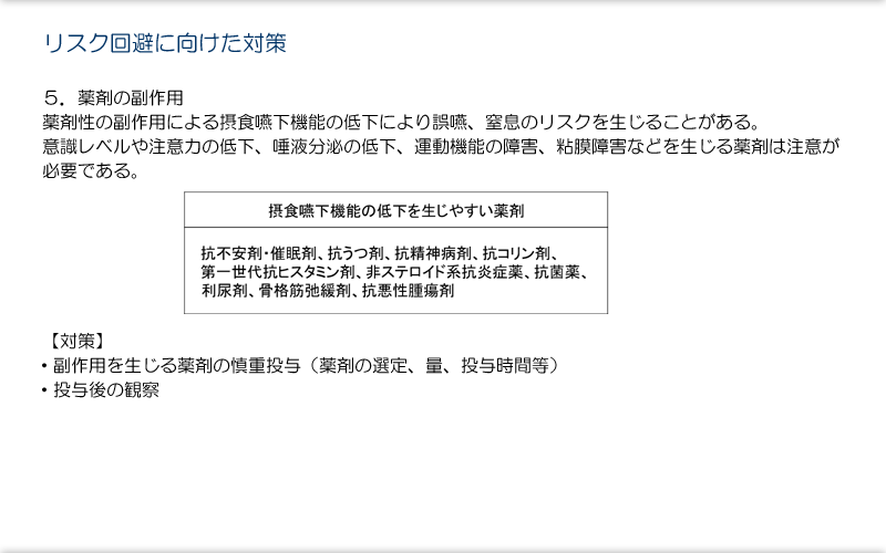 薬剤性の副作用による摂食嚥下機能の低下により誤嚥、窒息のリスクを生じることがある。意識レベルや注意力の低下、唾液分泌の低下、運動機能の障害、粘膜障害などを生じる薬剤は注意が必要である。